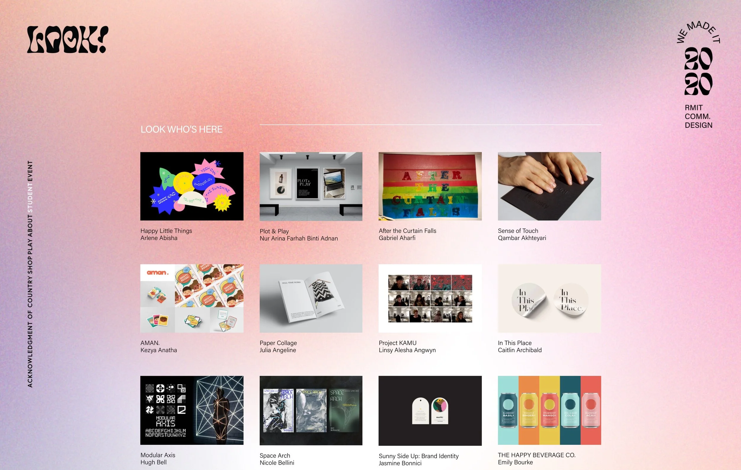 The School of Design, from RMIT commissioned a Graduation Show for the Communication Design students finalising their studies. I built ‘Look! We Made It’ within SquareSpace. Using my knowledge of PHP, HTML and CSS, we were able to create a user interface that is intuitive and enjoyable to explore, while showing off the amazing achievements of the graduating cohort of 2020.